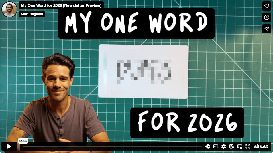 Hey Reader, I’ve been thinking about my word for 2026. I pick one every year, not as a goal but like a North Star. It needs to be something I can come back to when I feel stuck, hesitant, or tempted to overcomplicate things that don’t need it. This year’s word surprised me a little: Dumb. Not careless or reckless and definitely not irresponsible. Just less clever and strategic. Less interested in winning the imaginary argument in my head before actually doing the thing. 💡 One Big Idea: Be More Dumb in 2026See, being smart has worked out for me. I like planning, thinking things through, asking the right questions, and trying to make the “best” decision. But recently I’ve noticed that I’m trading too much certainty for speed and the possibility of just seeing what happens. So “dumb” is my permission slip for 2026. Dumb means I don’t need a big plan before I start. It means I don’t wait for confidence to show up first. It means I act while things are still a little unclear, trusting that action will teach me more than (over)thinking. Because when I’m willing to be a little dumb, I move faster. When I move faster, I build momentum. And when there’s momentum, things start to feel lighter and life and work starts to feel fun again. Most of the real progress I’ve made in life didn’t come from brilliant decisions made at the perfect time. It came from making fast, simple decisions and then making little corrections as I go along. When I’m dumb, I move faster. When I move faster, I have more fun. And when things are fun, I keep going. So when I catch myself stalling out this year, I’ll ask one question: what would a dumb version of me do right now? And then I’ll probably do that. 📹 Video to Watch:There's a more expanded, chatty edition of this newsletter as a soon-to-be-released YouTube video. I probably won't have it all the way done until Monday or Tuesday, but as a newsletter subscriber you get the first look today! 📚 Book to Read: The Birth of ParadiseMy friend Nat Eliason wrote a prequel novella to Husk (which I recommended last year) about how the Meru Initiative first started. It's very short and compelling, kinda like if you could interview the people who came up with the Matrix (fictionally speaking). Nat also has some great commentary on modern humanity, parenting, and consciousness. Highly recommend 👏🏻 What's your one word for 2026? Reply and let me know! Matt "dumb is fast" Ragland |