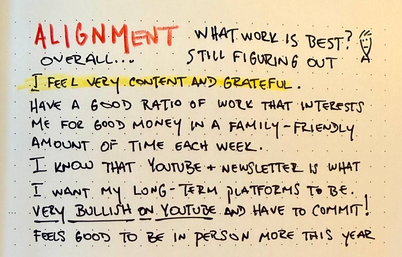 There were a lot of wins this year. A lot to build on. A lot to be motivated about going into next year. Results: What I Planned vs. What Actually HappenedThis is where most people get discouraged. So let me give you a warning before you do your own results review: Approach your results as a reporter, not a judge. A reporter observes. A judge condemns. If you judge yourself, you’ll spiral into self-loathing. If you report on yourself, you’ll see the full picture—what worked, what didn’t, and why. Let me show you what I mean. YouTube Growth: The MissI wanted to grow this channel to at least 150,000 subscribers this year. I’m going to end up maybe around 120,000. That’s still decent growth, but it’s way off what I hoped. The Judge says: “You failed. You didn’t even get halfway.” The Reporter says: “Okay, Matt didn’t hit 150k. But let’s look at the data. He spent a lot more time on client work, which led to increased revenue. His click-through rate, retention time, titles, thumbnails, and average views per month are all higher than ever. Subscribers didn’t grow as fast, but the channel improved in meaningful ways.” See the difference? Yes, I missed my subscriber goal. But I can see why I missed it, and I can see what did improve. That’s actionable. That’s useful. That’s not something to beat myself up over. Revenue: The Big WinMy goal was $150k. My stretch goal was $200k. I’m going to end the year over $240k, maybe even $250k depending on how December goes. That’s a massive win. It gives me momentum and motivation going into next year. Diversifying Revenue: Still a Work in ProgressAt the beginning of the year, about 80% of my revenue came from client work. I wanted to diversify—more coaching, more courses, more products. Now it’s closer to 65-70% from clients. Better, but I’d hoped to get down to 50/50 by the end of 2025. Still tilted too much toward clients. But here’s what this tells me: I have opportunities to pivot. I can see where to make small (or big) shifts to replace more client revenue with coaching revenue. That’s the kind of insight the reporter mindset gives you. Vacation and PresenceI took more vacation this year than I have in years. We took a few family trips. Plus, the move itself—there were solid four weeks where I worked closer to 20-30 hours instead of 40. Here’s what made me really encouraged: even during those part-time weeks, I still had good revenue. I realized I can take time off. I can slow down. I can be present for my family during a year of major change—and the business doesn’t fall apart. That’s a win I didn’t expect. The “Too Many Things” ProblemI probably still have too many things going on. At dinner with friends in Austin last week, they asked: “Are you doing the HeyCreator community, the YouTube channel, working with clients, or newsletter coaching? Which of these are you actually doing?” I said, “Yes. All of them.” They looked at me funny. In my mind, all these things feed each other. But I’ve also come to realize: if I really want to scale past $200-250k and get closer to $300k, $500k, or even $1 million and beyond, I probably need to focus on one thing. I’m stretching my attention too thin. I know that. The reporter in me sees it clearly. I don’t know what I’ll do about it yet, but it’s there. Alignment: Am I Living the Life I Want to Live?This is the “woo-woo” part of the review, but it’s also the most important. Alignment is about asking yourself: Is the work I’m doing, the life I’m living, and the things I’m doing every day in alignment with the person I want to become? This isn’t as analytical as wins or results. You can’t just look at a spreadsheet and answer it. You have to sit with the question. You have to be honest. And here’s the thing: don’t let this question spiral you into dissatisfaction. A lot of people ask, “Am I aligned?” and immediately think, “No, I need to blow up my entire life.” Maybe you do. But for most of us, alignment isn’t about quitting everything, it’s about small, intentional shifts. How I Feel About Alignment This YearI feel very much in alignment with what I want to be doing from a work perspective. I’d love to focus more on YouTube and maybe write a book I’ve been toying with. But if doing those things means cutting my revenue in half? No way. That would be out of alignment with the kind of father, husband, and provider I want to be. Here’s what I wrote in my journal: “I have a good ratio of work that interests me, for good money, in a very family-friendly amount of time each week.” That’s alignment. I’m not doing everything I want. But I’m doing meaningful work that supports my family, gives me creative fulfillment, and doesn’t burn me out. That’s a win. The Power of Consistent Check-InsHere’s why I recommend doing this review not just annually, but weekly or at least monthly: If you only ask yourself “Am I aligned?” once a year, it’s hard to tell. You’re stuck with recency bias—how have I felt since Thanksgiving? That’s not the full picture. But if you’ve been asking yourself this question every week or month, you have 12 or 20 or 30 data points to look at. You can see patterns. You can see if you’ve been consistently aligned or if you’ve been drifting. That’s powerful. Pivot: What Needs to Change in 2026This is where everything comes together. I look at my wins, my results, my alignment—and then I ask: What kind of pivots or progression do I need to make next year to have more success or do more of the things that matter to me? The Slow Pivot: All-In on YouTubeUntil I start to focus on fewer things, my earning potential and online growth will be limited. I can still earn more. I can still grow. But there’s only so far I’ll get until I narrow my focus. For me, that focus is YouTube. YouTube is everything for me in terms of long-term ambition. I love making v